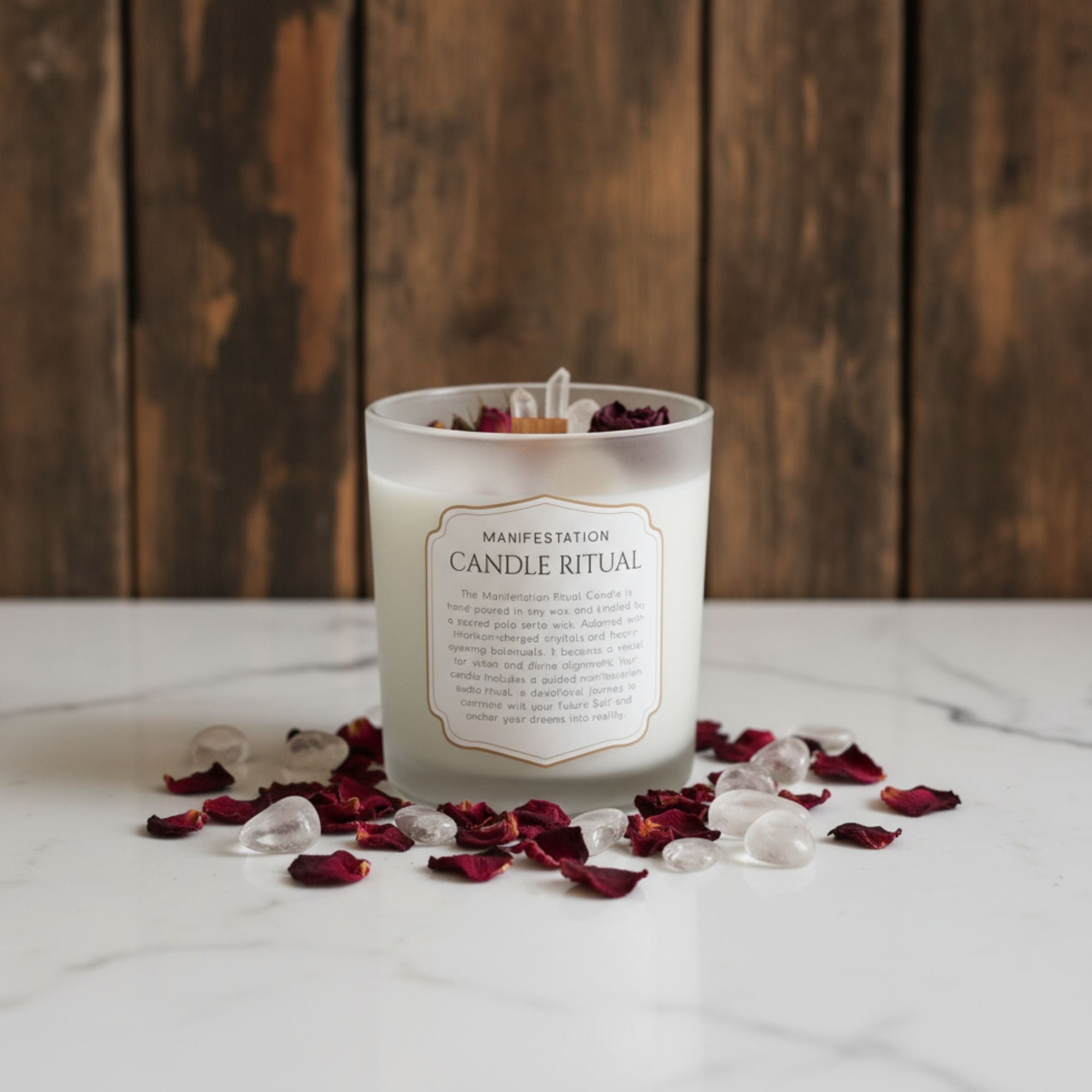 The Manifestation Ritual Candle is hand-poured from soy wax with bergamot essential oils, a natural wood wick, infused with crystals and botanicals to amplify your intentions. Each candle includes access to our guided manifestation audio practice, a meditation that helps you envision your future self and call that reality into being. Light the flame, follow the ritual, and let your dreams take flight.