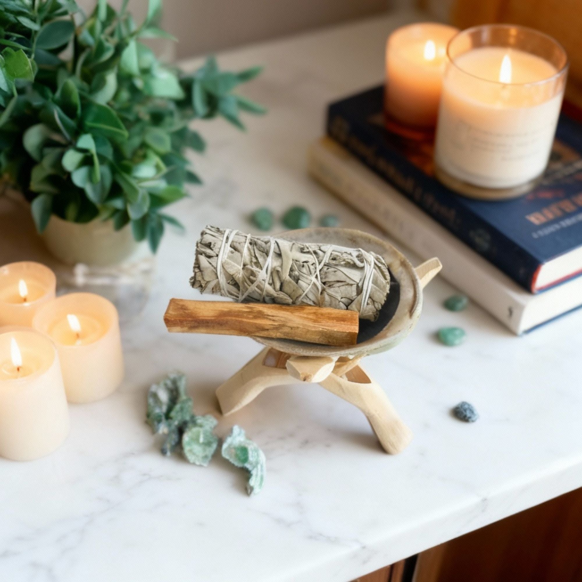 Each element is thoughtfully chosen for its purity and energy: CE-certified sage and palo santo, paired with sustainably and ethically sourced abalone, and presented on a naturally weathered driftwood stand. Together, these sacred offerings honor both Earth and spirit, creating a ritual set that embodies integrity, beauty, and elevated energy for your practice.