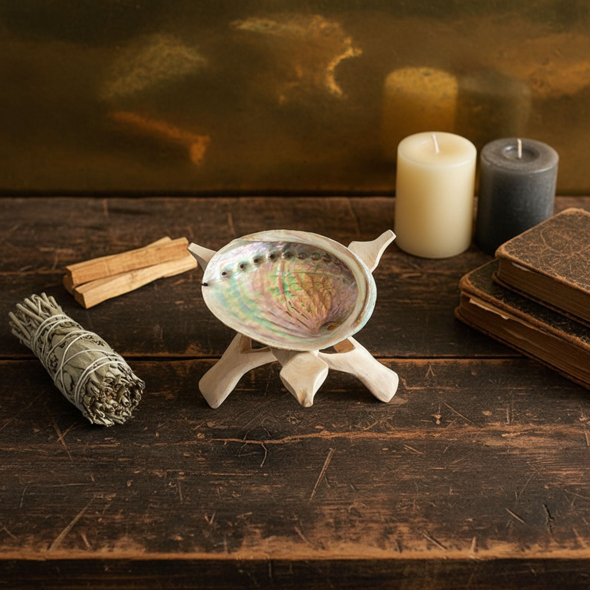 In traditional practices, smoke from this ritual is seen as a messenger — carrying prayers, intentions, and stagnant energies upward to be transmuted. The abalone shell holds the burning embers, grounding the ritual in the element of water, while the smoke calls on air, the flame invokes fire, and the wood and herbs return you to earth.